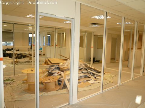 Un parti pris du blanc dominant (cloisons et portes blanches, plateaux de bureaux blancs) relevé par des touches de couleur rouge, assise des fauteuils, lampe, fauteuil de repos …