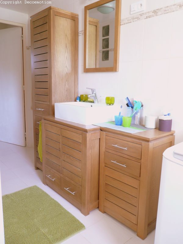 La même structure, pratiquement la même gestion de l’espace, mais de nouveaux matériaux dans l’air du temps. Un style nature très épuré et clair, une frise en marbre (pierre aspect mat). Faience et carrelage blanc nuancé et de grands formats.